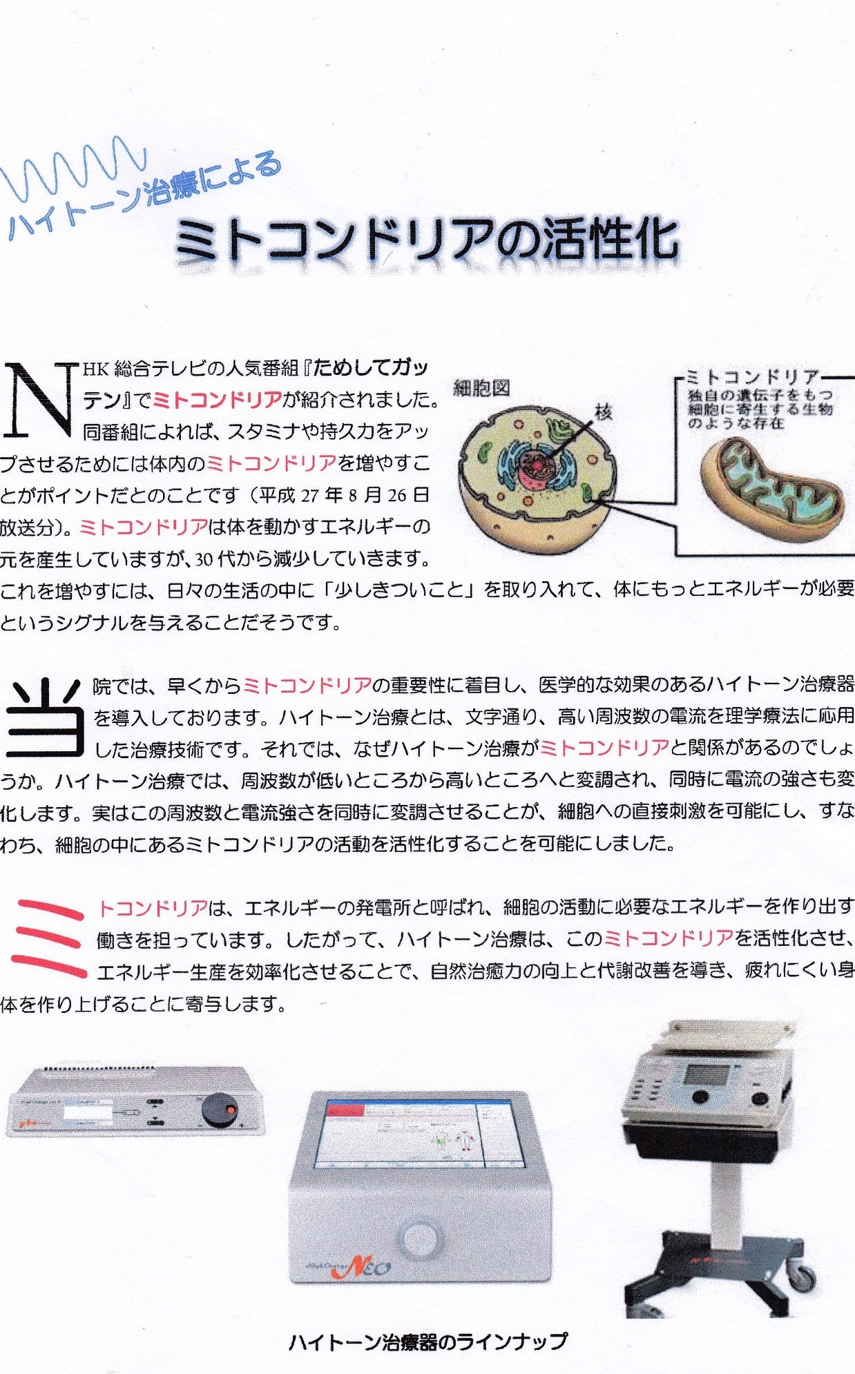 細胞レベルまで電流を流すことにより直接刺激し、ストレスや疲れ、老化等により眠っていた細胞を目覚めさせます。細胞が体内で元気に活動をはじめ活性化し、新陳代謝が向上、体質改善へと導きます。周波数と振幅を同時に変調させる低周波治療です。従来の電気治療では周波数のみを変調させるため、周波数は変調しても振幅は一定でした。ハイトーン治療では周波数と振幅を同時に変調させることにより、細胞レベルで神経や筋肉に刺激を与え、より高い治療効果が期待できます。