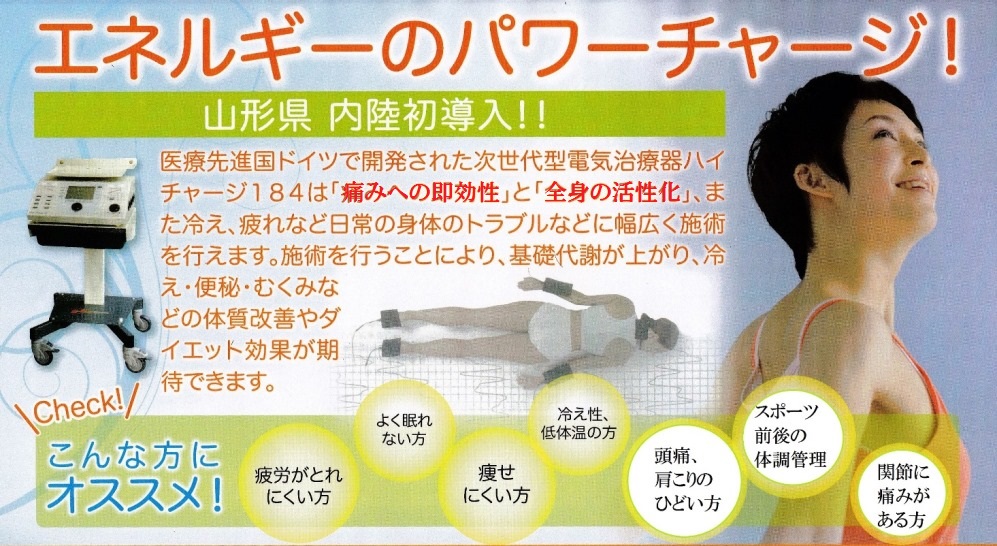 ハイチャージ184 highcharge184 ハイトーン治療 株式会社 http://www.sunmed.co.jp/medical/HighCharge184.html テクノリンク Techno Link 山形 接骨院 整体院 鍼灸院