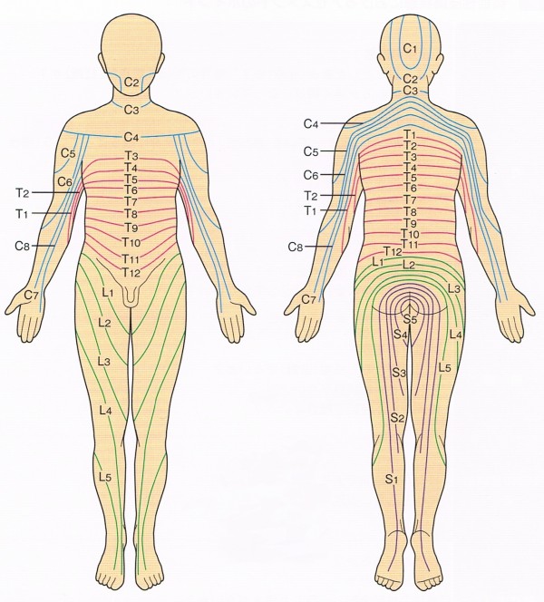 皮膚の表面はデルマトーム(皮膚知覚帯)と呼ばれる特定の領域に分かれていて、各区分を1つの脊髄神経根の感覚神経線維が支配しています。