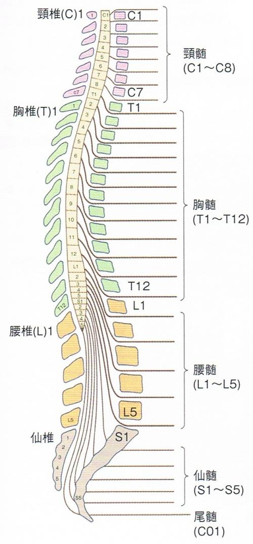 12個の胸椎、5個の腰椎、5個の仙椎のそれぞれにも、体の左右に1つずつ1対の脊髄神経根があります。